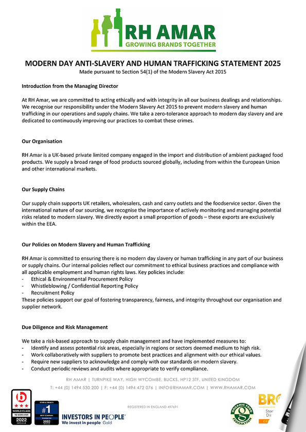 RH Amar is committed to ensuring there is no modern day slavery or human trafficking in any part of our business